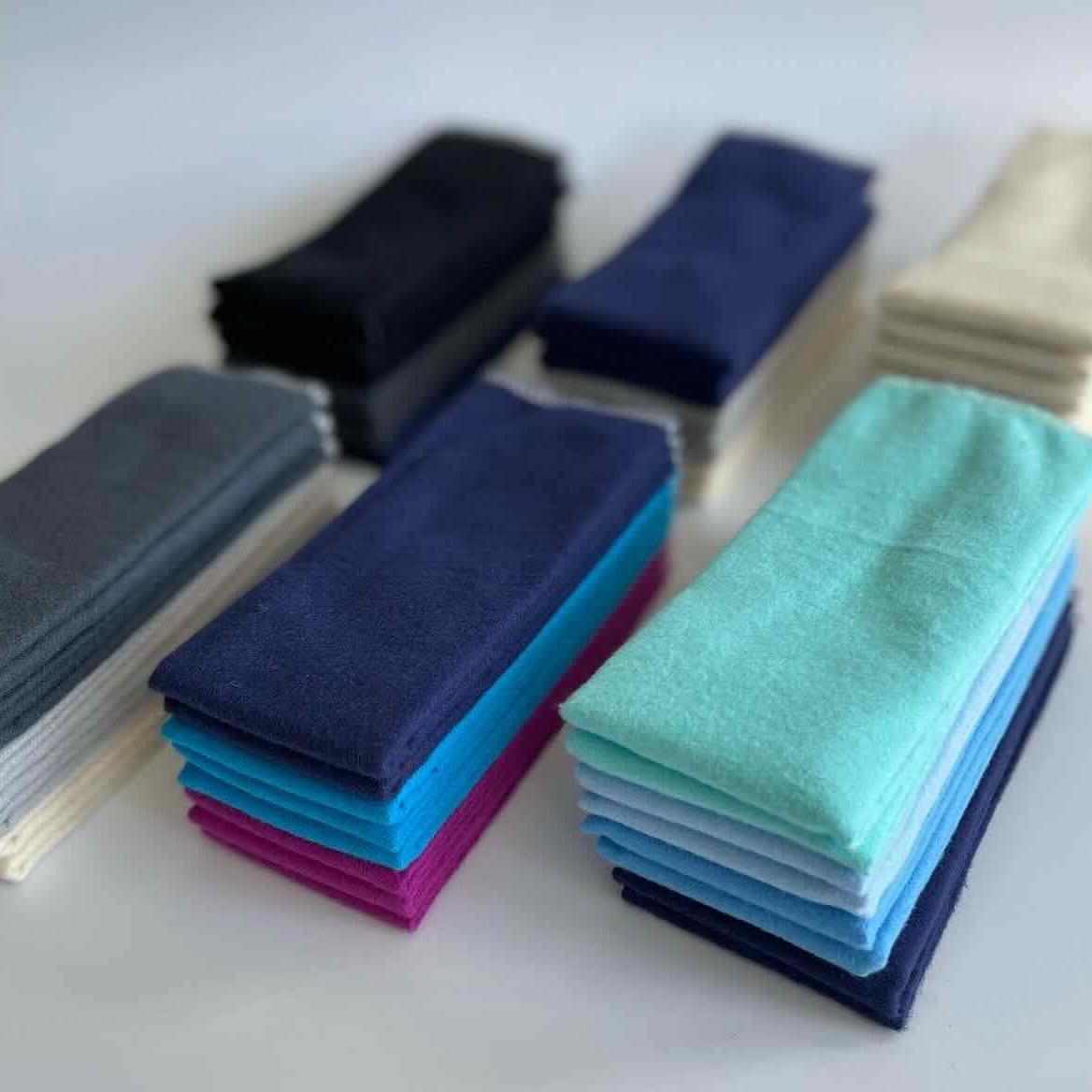 Our reusable paper towels and cloth wipes are made from super soft and absorbent 100% cotton flannel. These cloth towels and wipes are not pre-washed, so they are least absorbent when first used. Flannel naturally becomes softer and absorbent wash after wash.